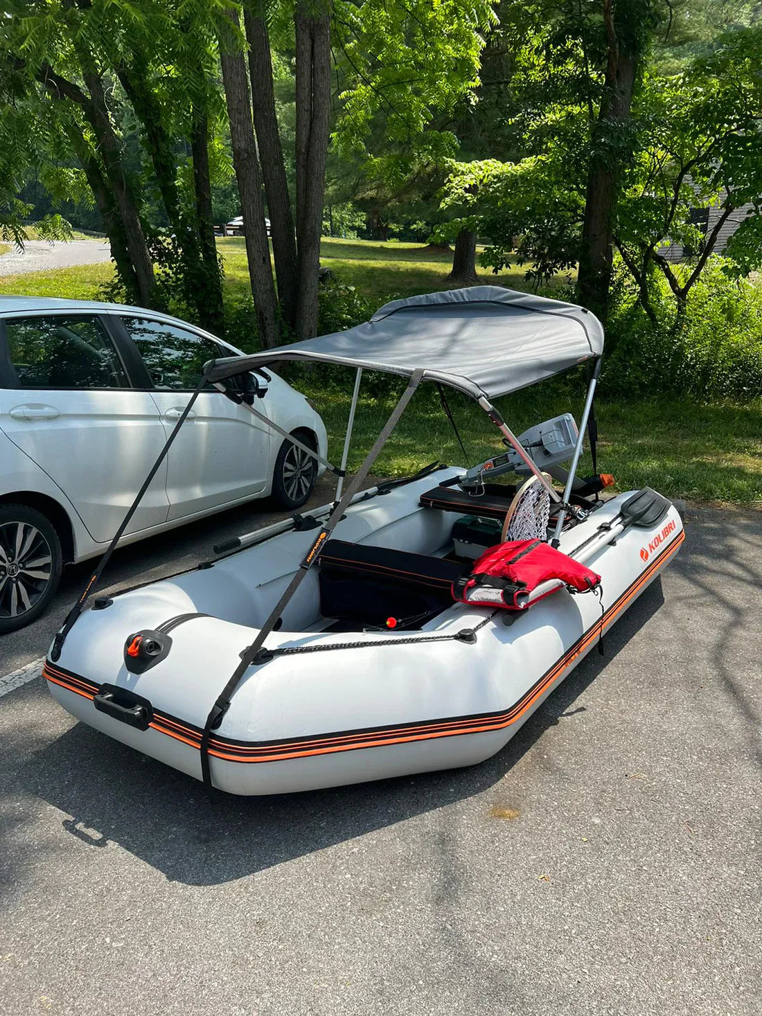 The KM-330 is a flat-bottomed inflatable boat perfect for calm lakes and rivers. It can carry four persons with a 12 hp motor.