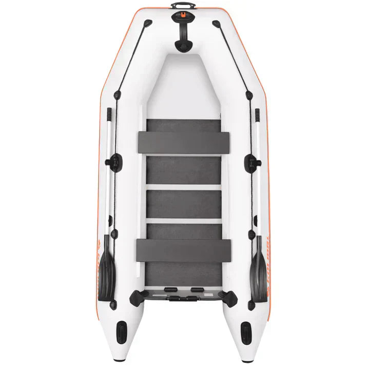 Crafted from top-quality PVC with heat-welded seams, this inflatable boat boasts durability and longevity with a five-year warranty. The high-pressure inflatable floor provides easy assembly and stability, while the air deck adds extra rigidity for a secure and comfortable experience on the water.