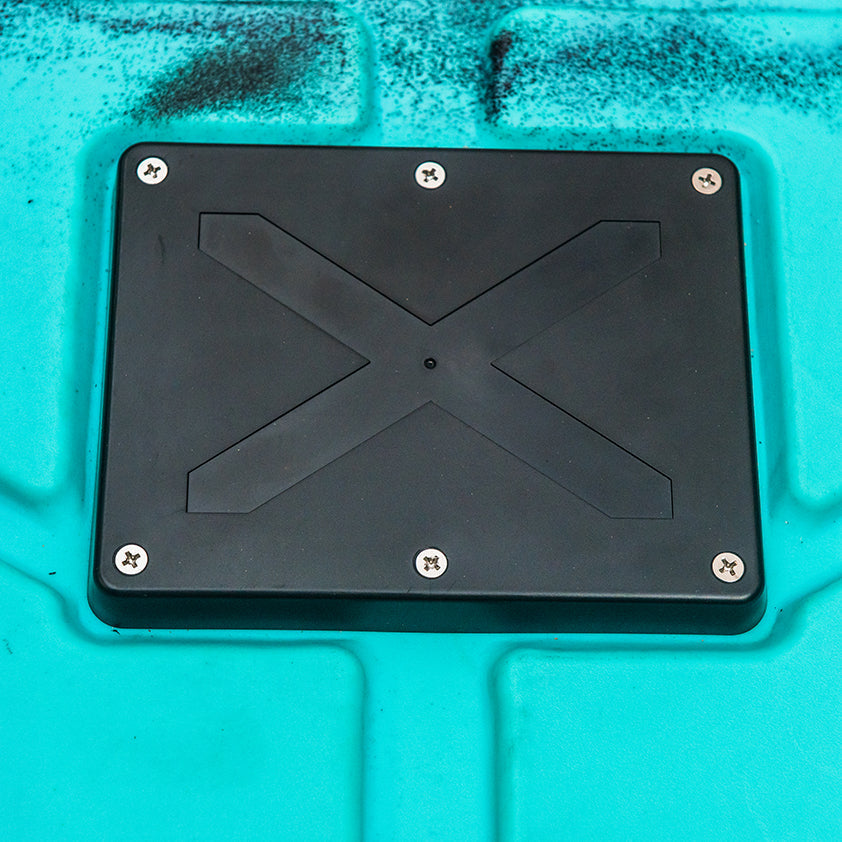• Storage: At first glance, Zambezi's immense storage ability stands out immediately. A lockable rectangle hatch positioned behind the Aluminum seating opens into the hull, creating a large area for storage for your camping gear or catch of the day. The hatch on the bow of the Kayak is secured by cross-braced bungee cording for security, and this is terrific for anchor and safety equipment. Below the bow hatch, a center console hatch opens towards the paddler, allowing for easy reachable access. Positioned In front of the raised aluminum seating is the toolbox hatch to set up your fishfinder. The toolbox has enough space for your sealed lithium battery and extra cabling to keep your deck free of clutter and wiring. Regarding the transducer, there is a scupper plug with a perforated hard 4mm nylon cover with brass inserts to easily mount your sonar, and this is close to the toolbox, limiting the amount of wiring length needed.